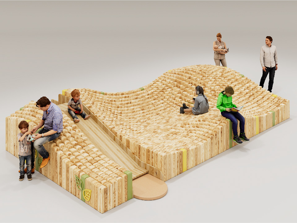 生命の胎動を無垢の木で表現したシンボルオブジェ。子どもの遊具であり、みんなが集うベンチにもなる、賑わいとわくわくが生まれる家具です。